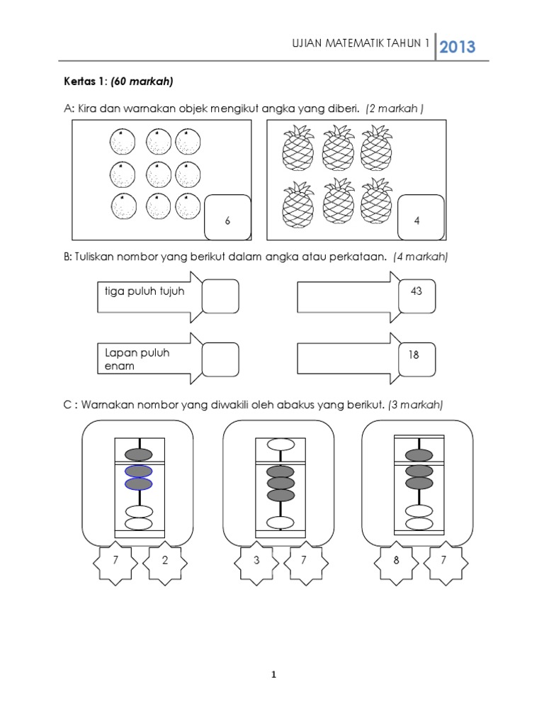 Soalan Ujian Matematik Kertas 1 Kssr Tahun 1 Pdf
